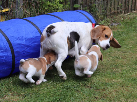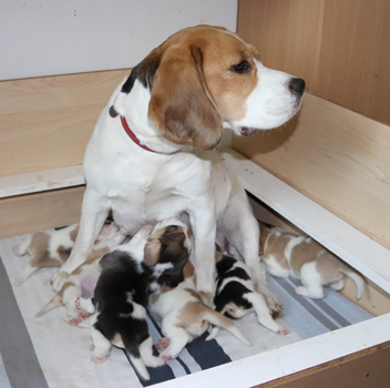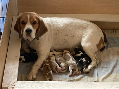 ... Joselyn brachte völlig unkompliziert und total instinktsicher 8 Welpen zur Welt, 4 tricolour und 4 harepied. Eine kleine tricolour-Hündin, mit gut 150 g Geburtsgewicht kam leider schon tot zur Welt ;o(. Nun hatten wir noch 2 Rüden und 1 Hündin in der Farbe tricolour und 3 Rüden und 1 Hündin in der Farbe harepied in der Wurfkiste bei Mama Joselyn liegen ;o).